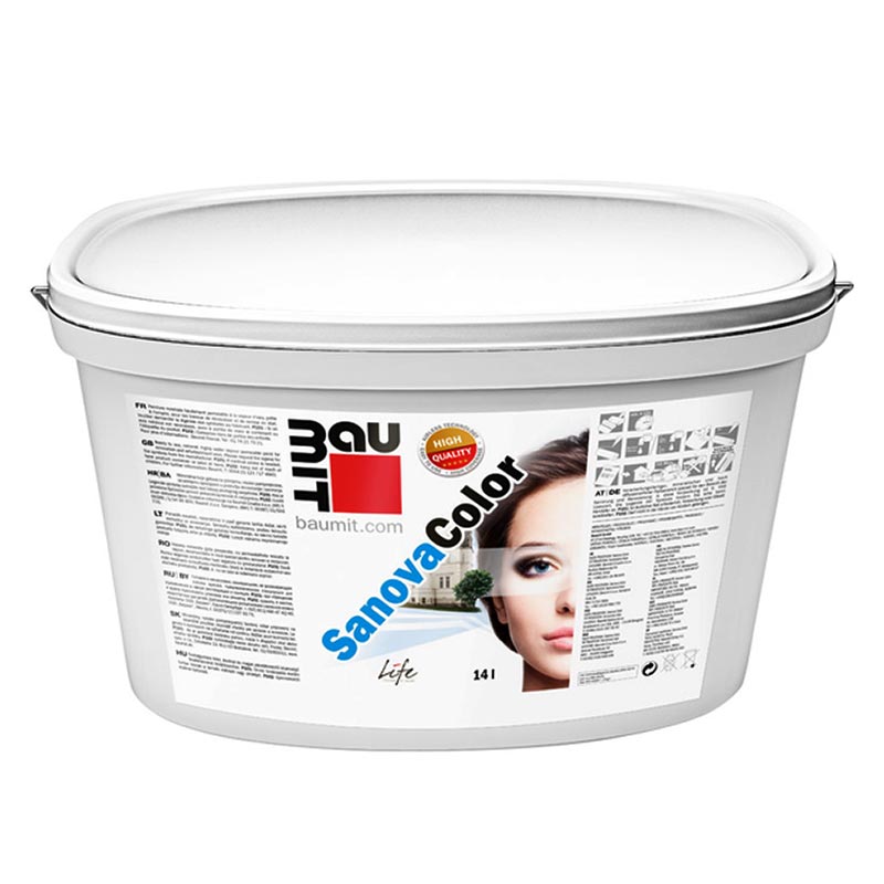 BAUMIT SanovaColor боя за реставриране, 14л Готова за полагане, силно паропропусклива, на основа водно стъкло минерална боя за защита и украса на фасадите, подходяща за полагане върху стари и нови минерални мазилки и шпакловки. Особено подходяща за защита на паметници и реновиране както вътре, така и вън. Грундиране и разреждане с Баумит СановаПраймер, съгласно техническата карта на продукта. Може да се оцветява в цветове Баумит Life, чиито номера завършват от 4 до 9. – Минерална – Дишаща – Специално за исторически сгради Разход: ок. 0,32 л/м2 за две нанасяния Покриваемост: ок. 45 м2/кофа за две нанасяния Опаковка: кофа 14 л, 1 палет = 24 кофи = 336 л