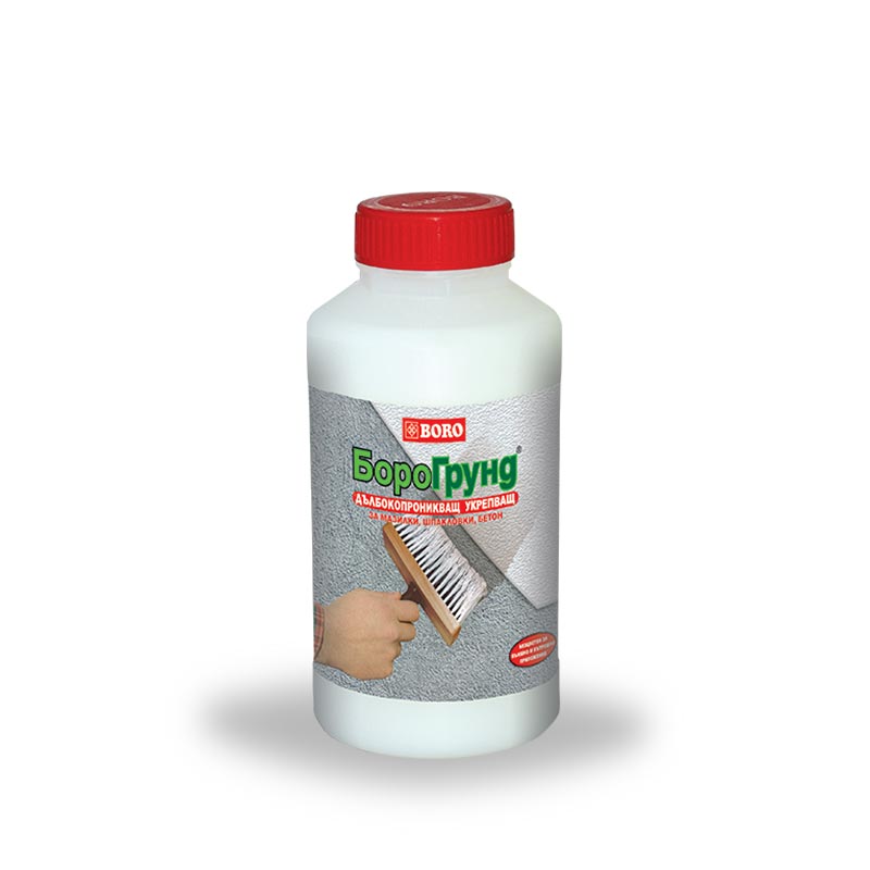 Грунд BORO Борогрунд – дълбокопроникващ, укрепващ. Предназначение: Употребява се за грундиране на циментови, варо-циментови, гипсови мазилки и шпакловки, бетонови повърхности, газобетон, тухли и други преди нанасяне на латексни, фасадни бои, лепене на плочки с циментови лепила, лепене на тапети и коркови облицовки, полагане на паркет и др. Намира приложение и за грундиране на бетонови повърхности преди нанасяне на самонивелиращи се подови замазки. Свойства: – Екологично чист продукт. – Повишена проникваща способност в дълбочина на основата. – Много добро заздравяване на основата. – Намалява порьозността и осигурява добро сцепление със следващото покритие. – Лесно нанасяне с ниски загуби при нанасянето. Нанасяне: четка, валяк, шприц пистолет. Съхнене при 20°С и 65% Н.R: 6 часа Разреждане: с вода (в съотношение грунд:вода до 1:5) Цвят: млечно бял Условия за нанасяне: от 5°С до 35°С. Не се допуска смесване с други аналогични продукти Разходна норма: неразреден 40-60ml/m2, съответно разреден 200-250 ml/m2, за газобетон 350ml/m2 Гаранционен срок: 24 месеца от датата на производство Съхранение: от 5°С до 35°С .