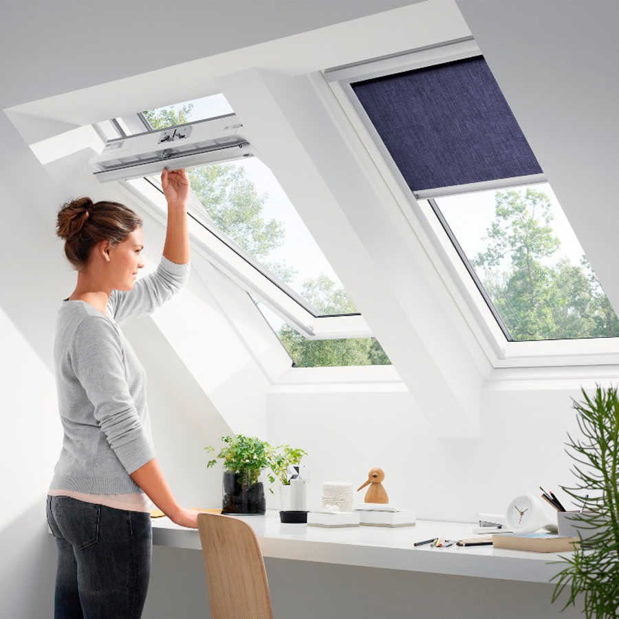 Влагоустойчив покривен прозорец с троен стъклопакет и горно управление. Идеален за бани и кухни. Лесен за почистване и монтаж на щори. Енергийно ефективен.