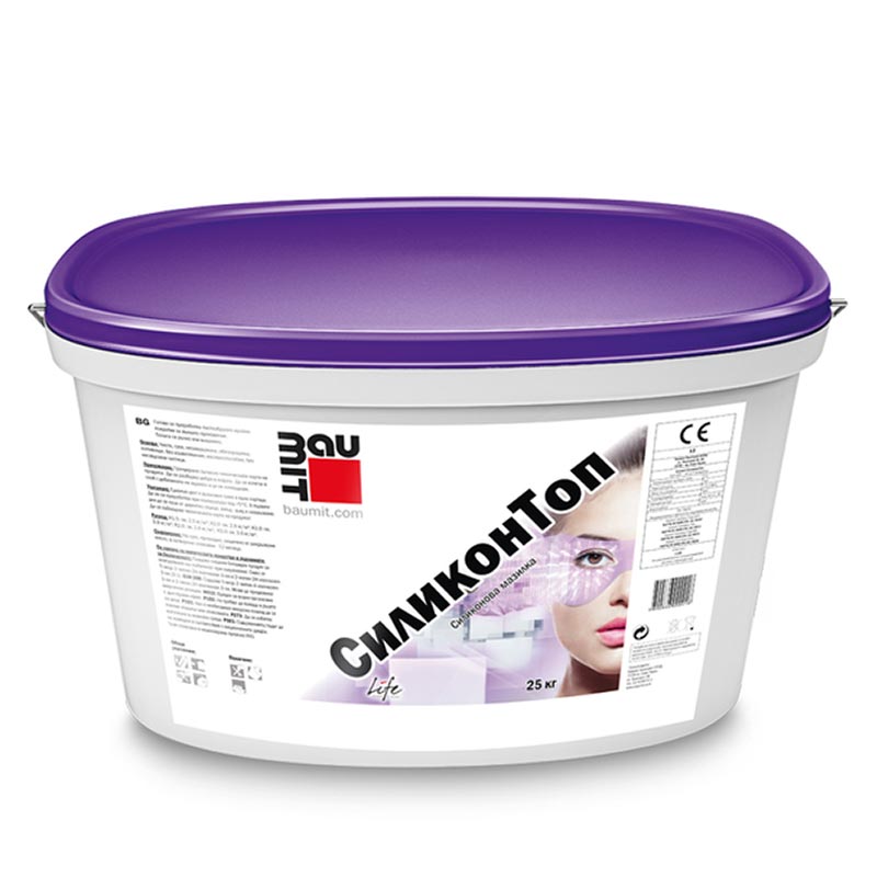 BAUMIT SilikonTop професионална фасадна мазилка K 1.5мм, 25кг Пастообразна мазилка на основа силиконови смоли, водоотблъскваща, с универсално приложение, устойчива на атмосферни влияния, лесна за обработка, за външно полагане. Оцветява се в цветове по каталога Life с номера, завършващи на цифри от 2 до 9, които нямат допълнително означение „полукръг“. – Първокласна защита – Отблъсква водата и мръсотията – Универсална Разход: ок. 2,5 кг/м² Покриваемост: ок. 10 м²/кофа