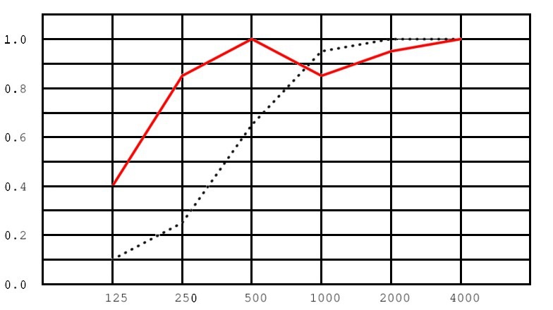 Звукопоглъщане-резултати от от тестването в съответствие с EN ISO 354. Класификация в съответствие с EN ISO 11654, както и рейтингите на една стойност за NRC и SAA според ASTM C 423