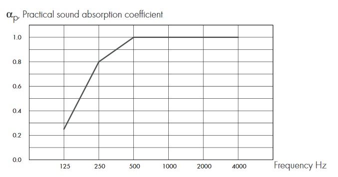 Звукопоглъщане-резултати от от тестването в съответствие с EN ISO 354. Класификация в съответствие с EN ISO 11654, както и рейтингите на една стойност за NRC и SAA според ASTM C 423.