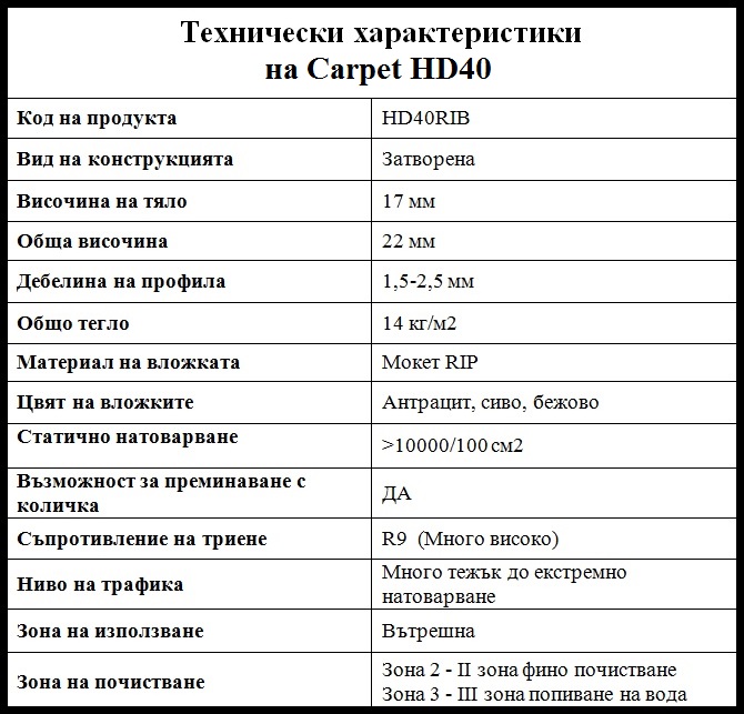 Ние Ви предлагаме едно изгодно, разумно и икономично решение на вашите нужди. Изтривалките за вграждане HDDMS Carpet, от сериите L45, HD40 и HD60 отговарят на всички изисквания за пространства, подложени на много тежък трафик. Специално разработени за вътрешно използване, притежава отлична абсорбция на влага и почистващи свойства. Това прави изтривалките от серията Carpet подходящи за всеки дом, бизнес сграда, болници, ресторант или всеки един голям или малък търговски център.