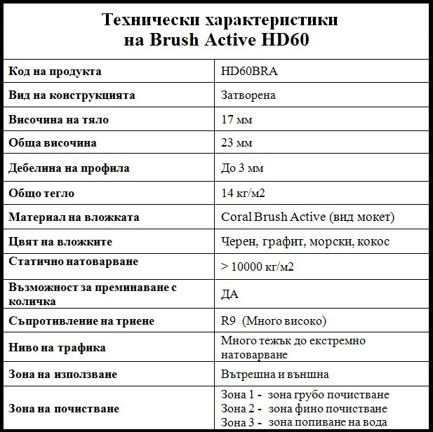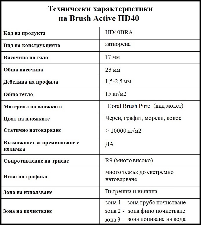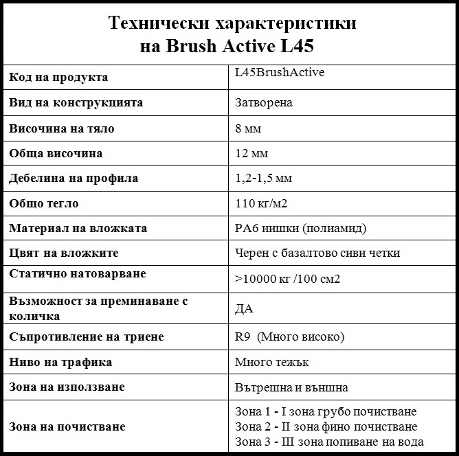Това прави изтривалките от серията Brush Active подходящи за всеки дом, бизнес сграда или всяки един голям или малък търговски център. Уникалният начин на сглобяване позволява, входните изтривалки да се произвеждат и доставят, съгласно предпочетени и избрани размери от клиентите ни.