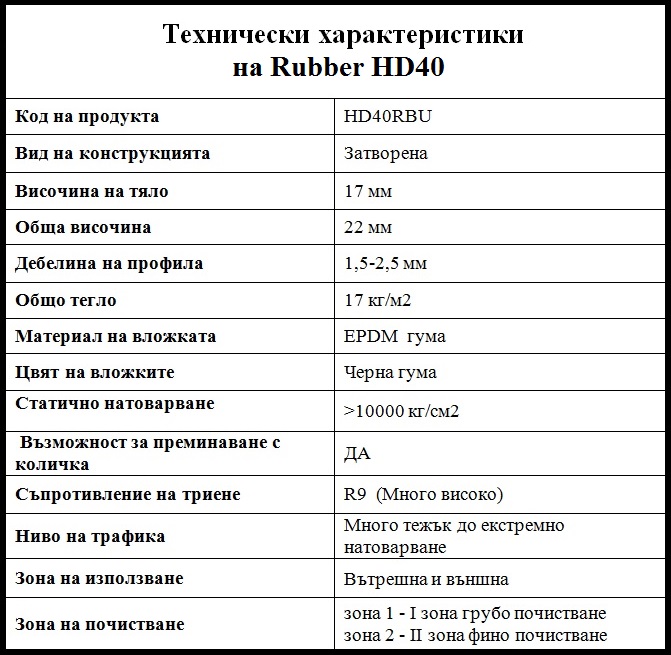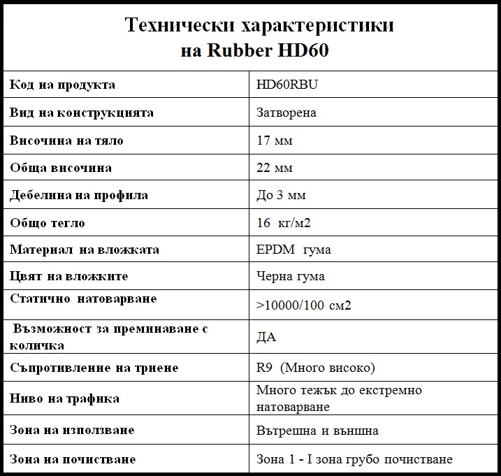Начина на проектиране на входните изтривалки HDDMS от категорията Rubber позволява ефективното премахване на замърсяванията, по този начин се осъществява по-качественото почистване на обувките, като същевременно осигурява висока трайност в съчетание с не-хлъзгава повърхност. Гумените вложки са произведени от висококачествени материали и притежават UV устойчивост, както и устойчивост на атмосферни влияния.