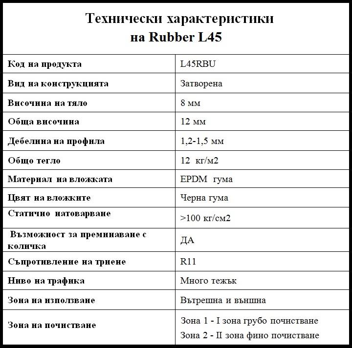 Това прави изтривалките от серията Rubber подходящи за всеки дом, бизнес сграда, болница, магазин, супермаркет или всеки един голям или малък търговски център. Уникалният начин на сглобяване позволява, входните изтривалки да се произвеждат и доставят, съгласно предпочетени и избрани размери от клиентите ни.