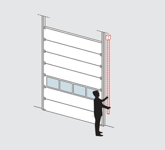 Индустриалната секционна врата има възможност да се задвижи ръчно, с помощта на въже или верижна лебедка, в зависимост от теглото и размера на вратата |