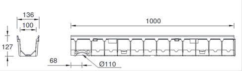 Улей стъклопласт GRP MEAFLUID NW100 композитен ръб височина 127 mm, , L=1000 mm с интегрирани заготвениотвори за вертикално и странично заустване и композитна решетка В125.